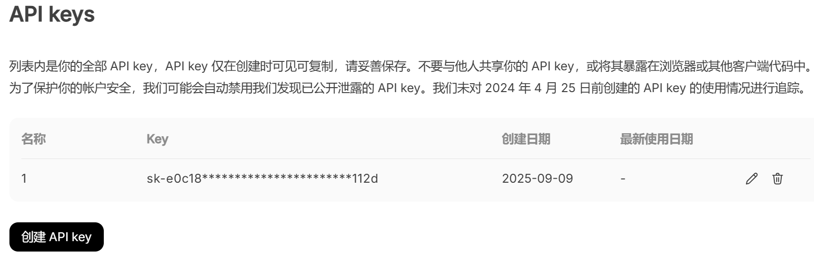 图4 复制API Key关闭“创建API key”弹窗后,API Key创建完成后如图5所示。