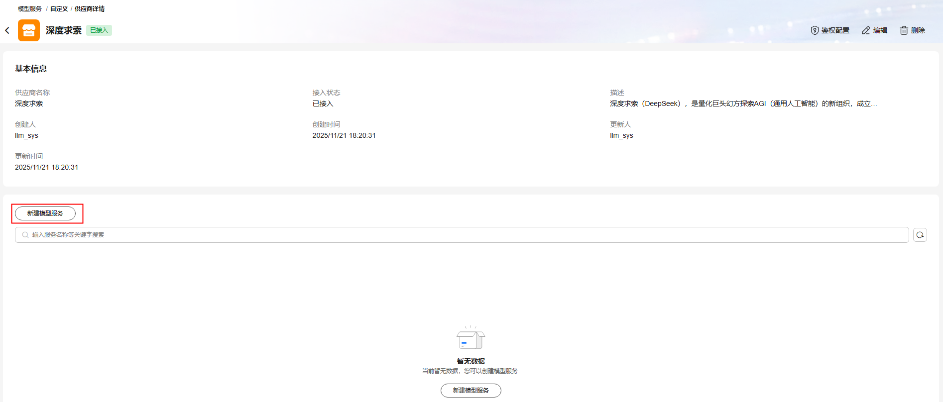 - 选择“自定义”页签,单击对应的模型供应商卡片,在“供应商详情”页面,单击“新建模型服务”。