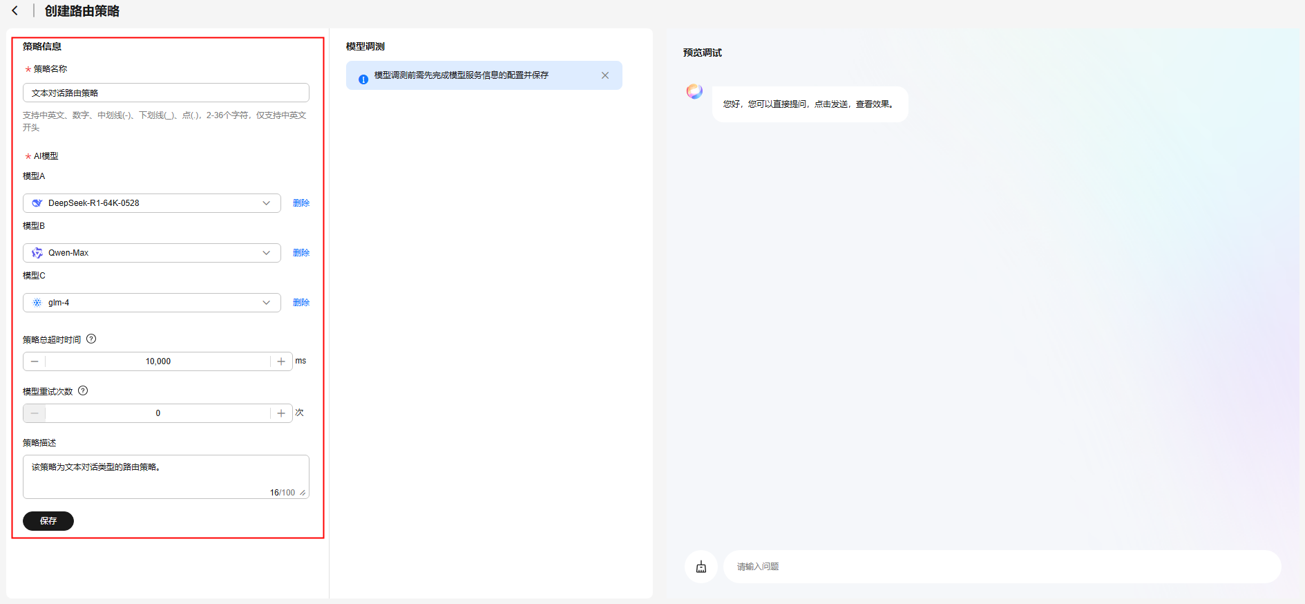 通过设置路由策略,可以实现模型故障自动切换功能。当模型A因故障等原因无法正常工作时,系统会自动切换至其他可用模型,继续提供服务,从而提升模型服务的稳定性和可用性。路由策略创建完成后,可以进行调测和使用。