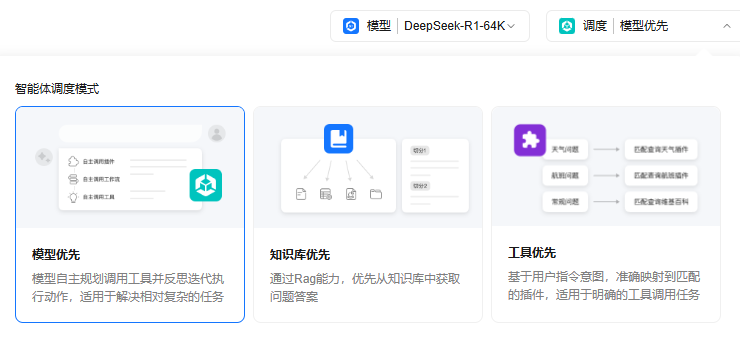 Versatile为智能体提供了多种调度方式,支持模型优先、知识库优先调度和工具优先方式,使用说明详见表1。