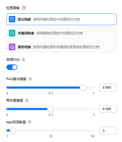 - FAQ直出阈值:FAQ检索超过阈值的结果将直接提交给大模型总结,不再进行文档检索。如果没有超过阈值的结果,将进行文档检索。