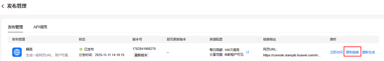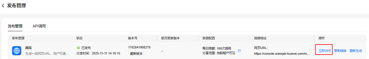 在发布管理页面,网页发布渠道的操作列单击“发布”按钮后将出现“立即访问”、“复制链接”、“重新生成”文字按钮。这里可以通过两种方式访问Agent应用的网页应用链接,同时支持重新生成发布链接。