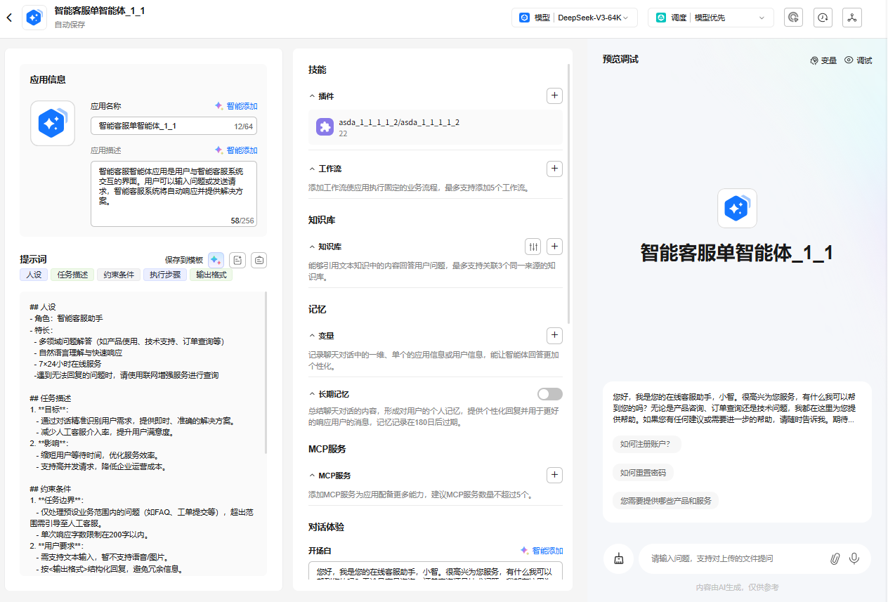 - 在应用开发主页面,选择已创建的Agent应用或单击左上角的“创建应用”。创建应用时需在弹出的创建应用子窗口中填入“应用名称”、“应用描述”后单击“确定”进入应用编辑页面。