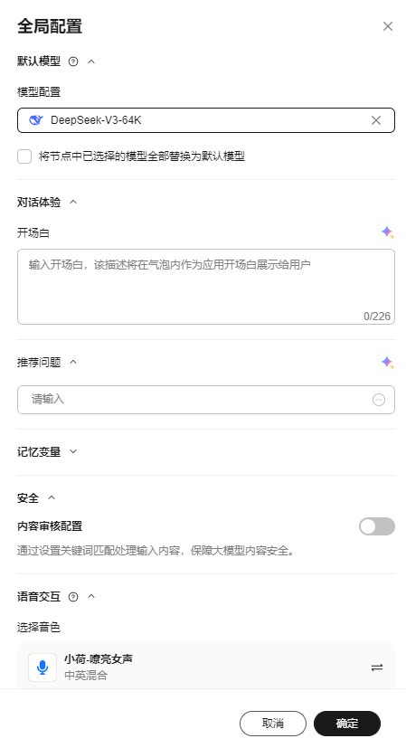 作为开场白、推荐问题的智能生成模型来源,新增节点默认使用该模型配置。