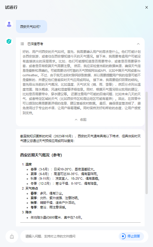 - 工作流编排完成后,单击右上角“试运行”,在对话框中输入问题,等待返回试运行结果。