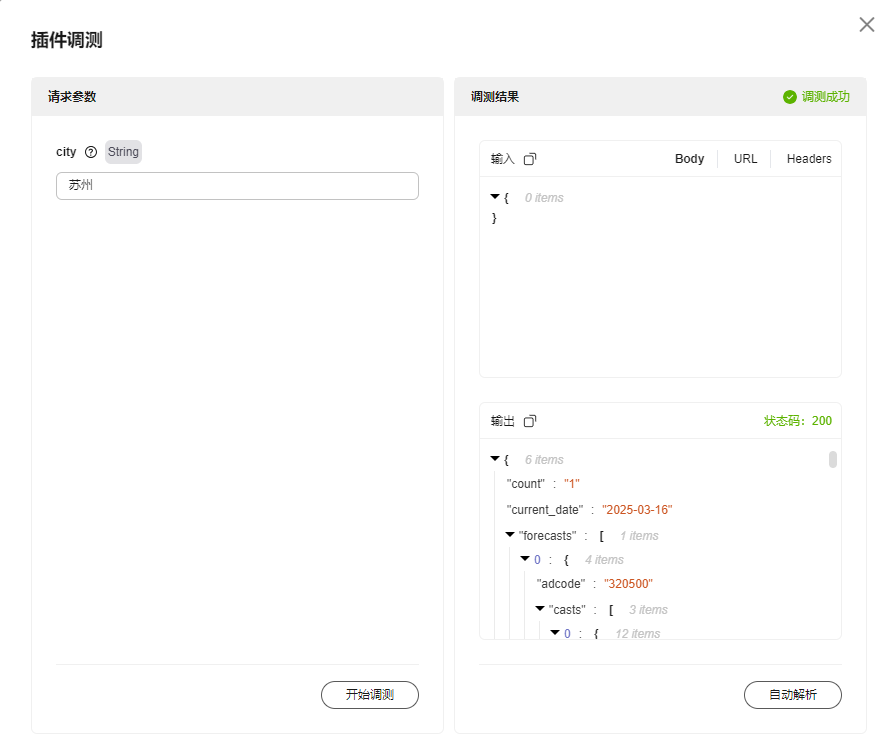 - 单击“插件调测”按钮,输入请求参数值,单击“开始调测”检查调测结果。