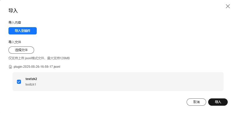 - 在“导入”页面,单击“选择文件”选择需要导入的jsonl文件。