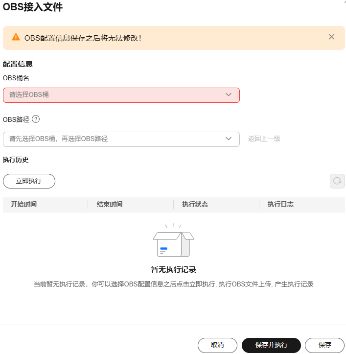 - 配置完成后,单击“立即执行”,或者单击“保存并执行”(仅首次配置OBS接入文件时出现该按钮)。
