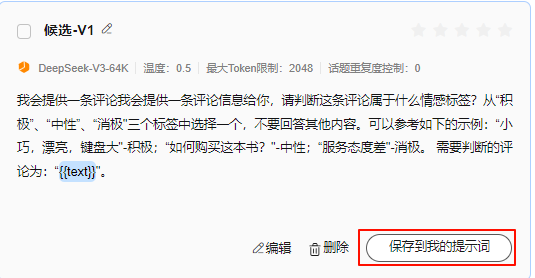 - 在提示词“候选”页面,选择质量好的提示词,单击“保存到我的提示词”。