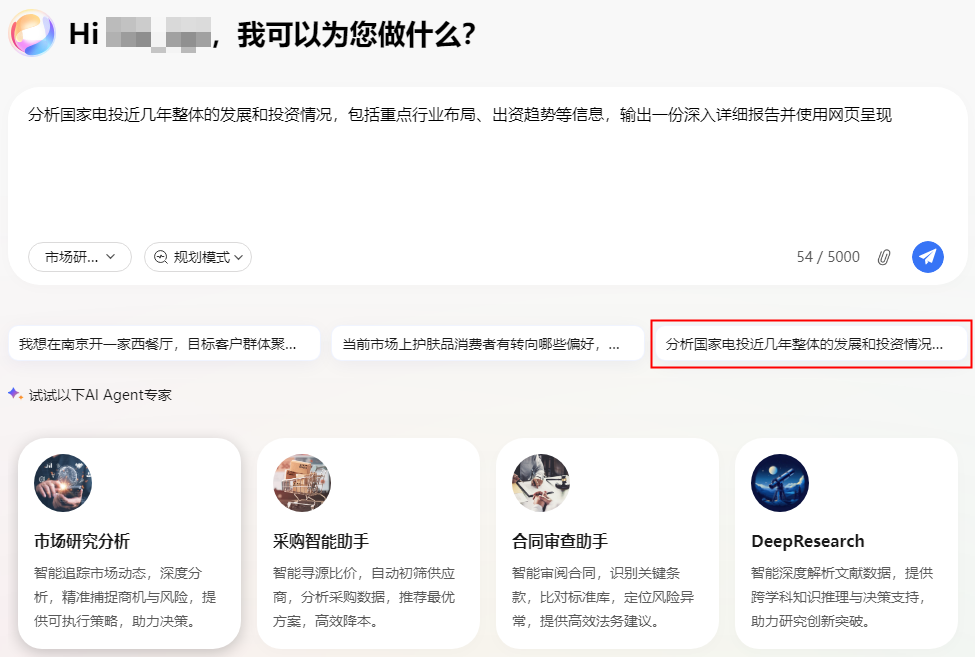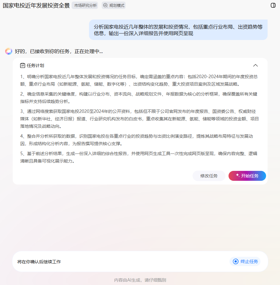 这里以界面提示词“分析国家电投近几年整体的发展和投资情况,包括重点行业布局、出资趋势等信息,输出一份深入详细报告并使用网页呈现”为例,单击该提示词,显示在任务输入框中。