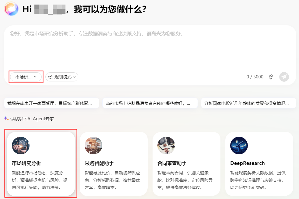 默认使用通用助手,这里以专家Agent“市场研究分析”为例。
