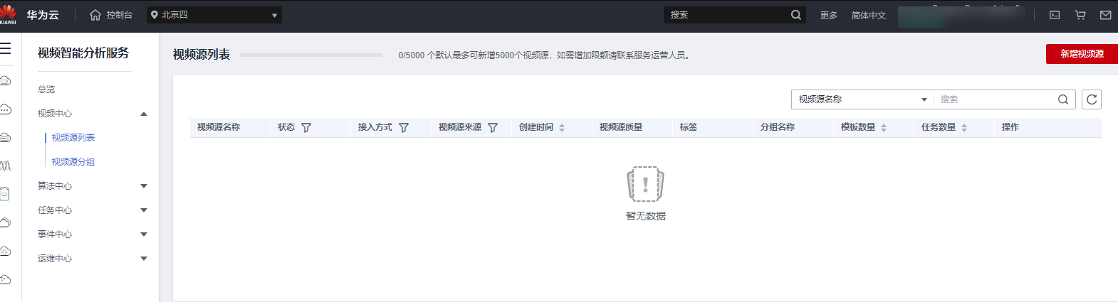 购买算法服务包后,单击“进入首页”,首页展示了视频智能分析服务包含的五个模块,如图2所示。本文档分别介绍了视频中心、算法中心、任务中心、事件中心、运维中心的功能及使用。
