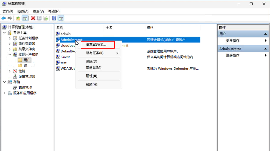 - 选择Administrator右键再次单击“设置密码”如图2所示,根据提示设置Administrator的账户密码。