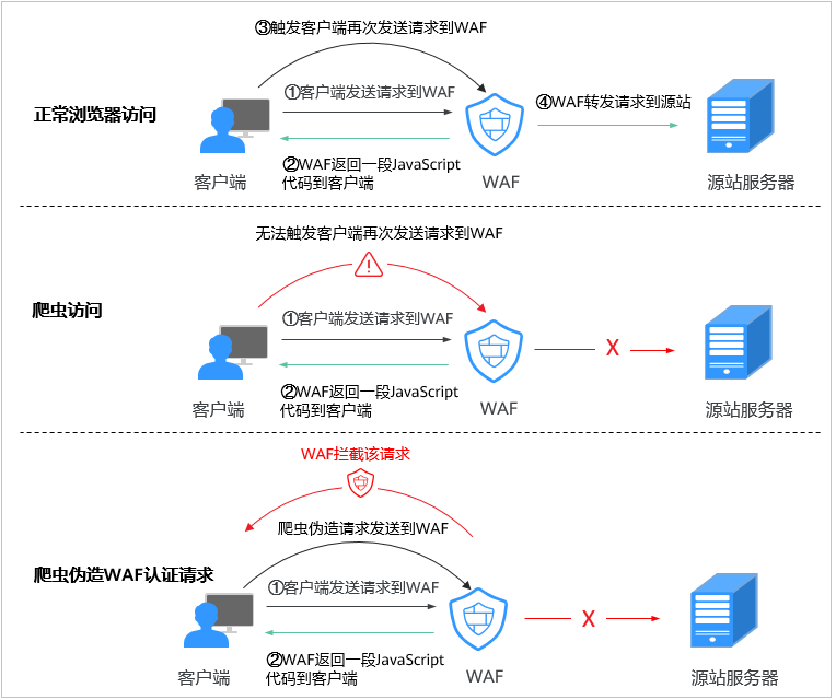 - 如果客户端是正常浏览器访问,就可以触发这段JavaScript代码再发送一次请求到WAF,即WAF完成js验证,并将该请求转发给源站。