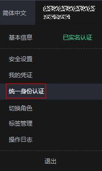- 进入华为云官网,打开控制台管理界面,鼠标移动至个人账号处,打开“统一身份认证”菜单。