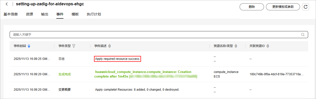 - 待“事件”页面出现“Apply required resource success”,表示该解决方案已经部署完成。