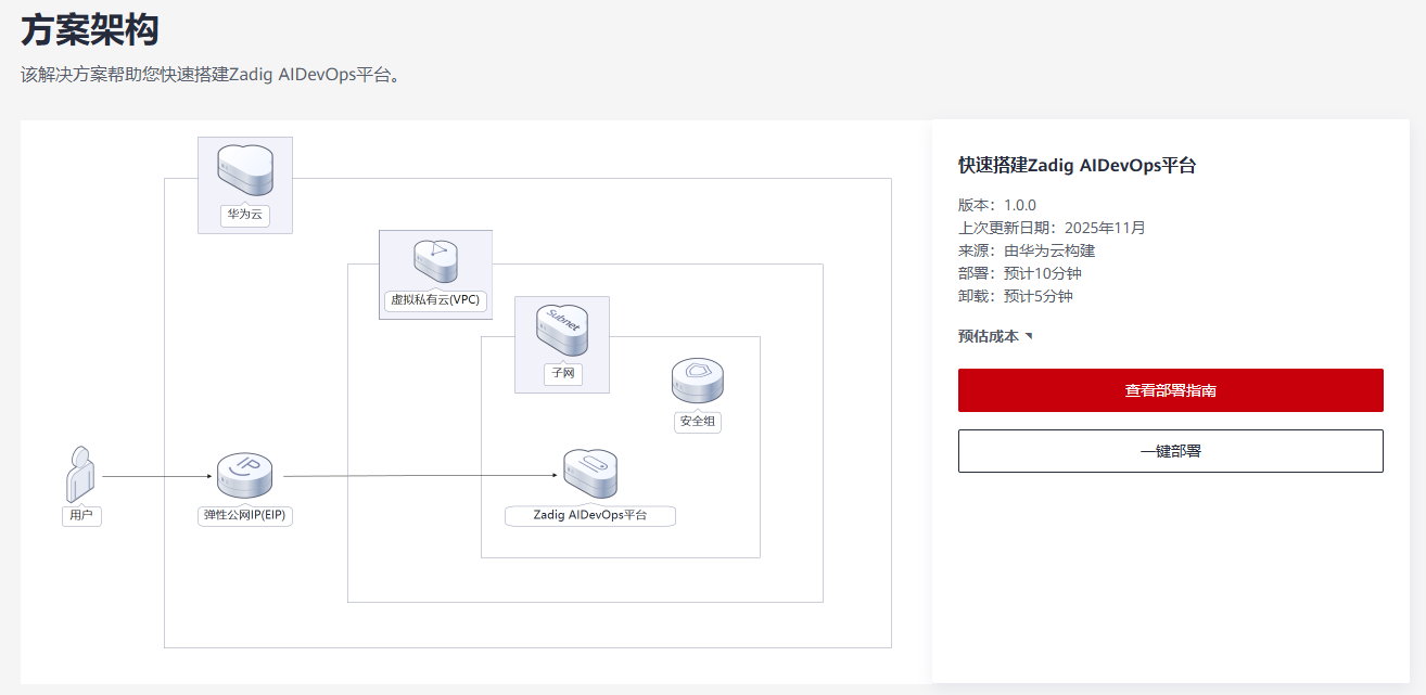 - 登录华为云解决方案实践,选择“快速搭建Zadig AIDevOps平台”,单击“一键部署”,跳转至解决方案购买页面。