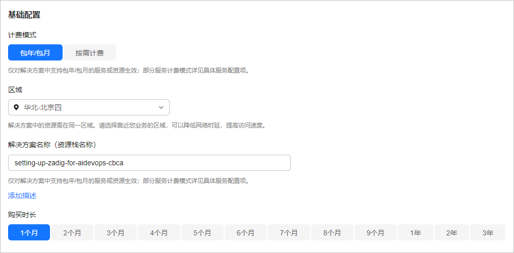 说明:仅对解决方案中支持该计费模式的服务或资源生效,例如选择了包年/包月计费模式,弹性公网IP仍会按实际使用的流量计费。详情请查看具体服务的配置项。